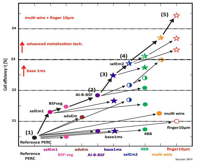 图:PERC电池效率提升的不同路线(来源:ISFH)