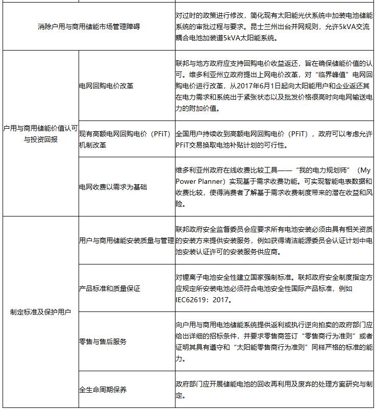由于澳大利亚的储能市场以户用与商用储能为主,工业大规模储能相对发展落后,因此政府目前政策制定工作着力于在规范户用与商用储能市场发展方面,2017年澳大利亚清洁能源协会向联邦政府提出了13项政策建议,涉及创造公平竞争环境;消除户用与商用储能市场管理障碍;户用与商用储能价值认可与投资回报;建立标准及保护用户四个方面)。