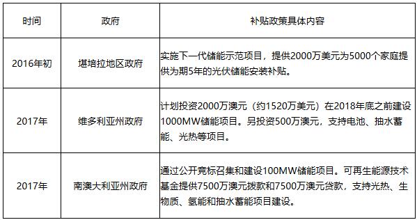2016年9月南澳大利亚州发生大范围停电事故,引起全国性能源安全的讨论。因此抽水蓄能、电池阵列等储能技术等电网大规模储能技术成为能源领域的焦点。澳大利亚各州政府相继推出一系列资金扶持性措施推动储能示范性项目的建立。
