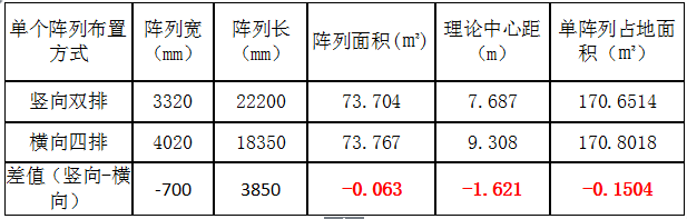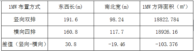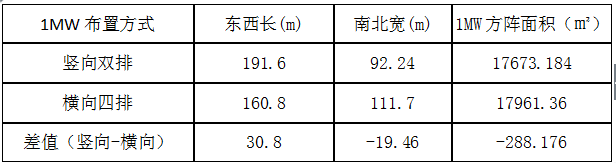光伏阵列间距增加0.5米冗余后,由于组件竖向布置时,1MW方阵的东西长度较长,因此增加的面积较大,再进行比较,1MW方阵横向四排比竖向双排布置方式理论上要增加103.376平方米。