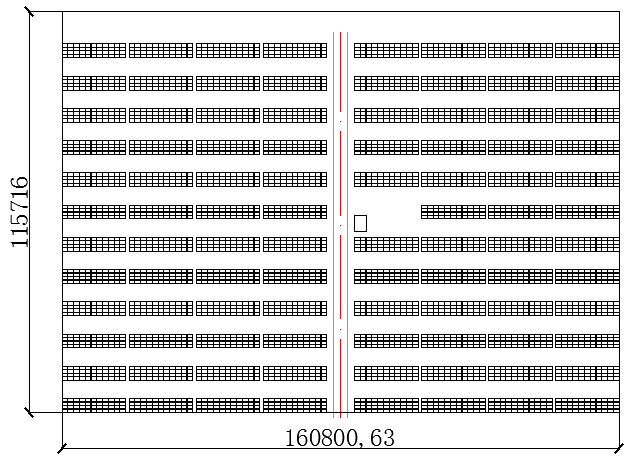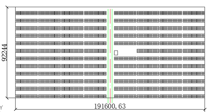 案例,在一个规则的长方形中,设计光伏组件总容量约21.736MW,支架单元数1900套,每个支架单元安装44块260Wp光伏组件。场地东西长约600米,南北宽约660米。方阵总平面图布置方式,竖向双排均采用1.086MW模块化设计,而横向四排的布置方式,大部分采用模块化设计,剩余场地采用非模块化设计。总平图主要设计3条竖向道路和一条横向道路,一圈环场道路,路网设计完全一致。