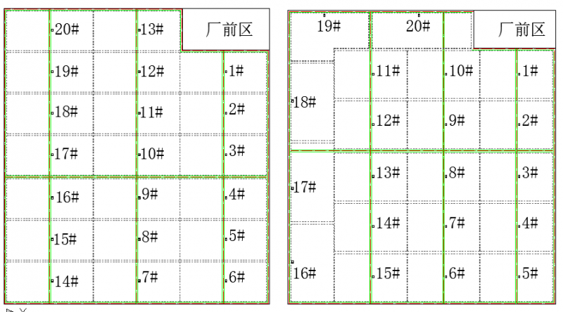 光伏组件竖排、横排1MW对比,是模块化布置很理想的状态对比,及实际项目边界范围自由的,不受限制。但实际上一个项目的场地边界是固定的,也无法采用或全部采用模块化布置。假设某项目规则的矩形场地范围,东西长度一定,南北宽度一定、道路长度确定,现以20MW的布置为例分析。