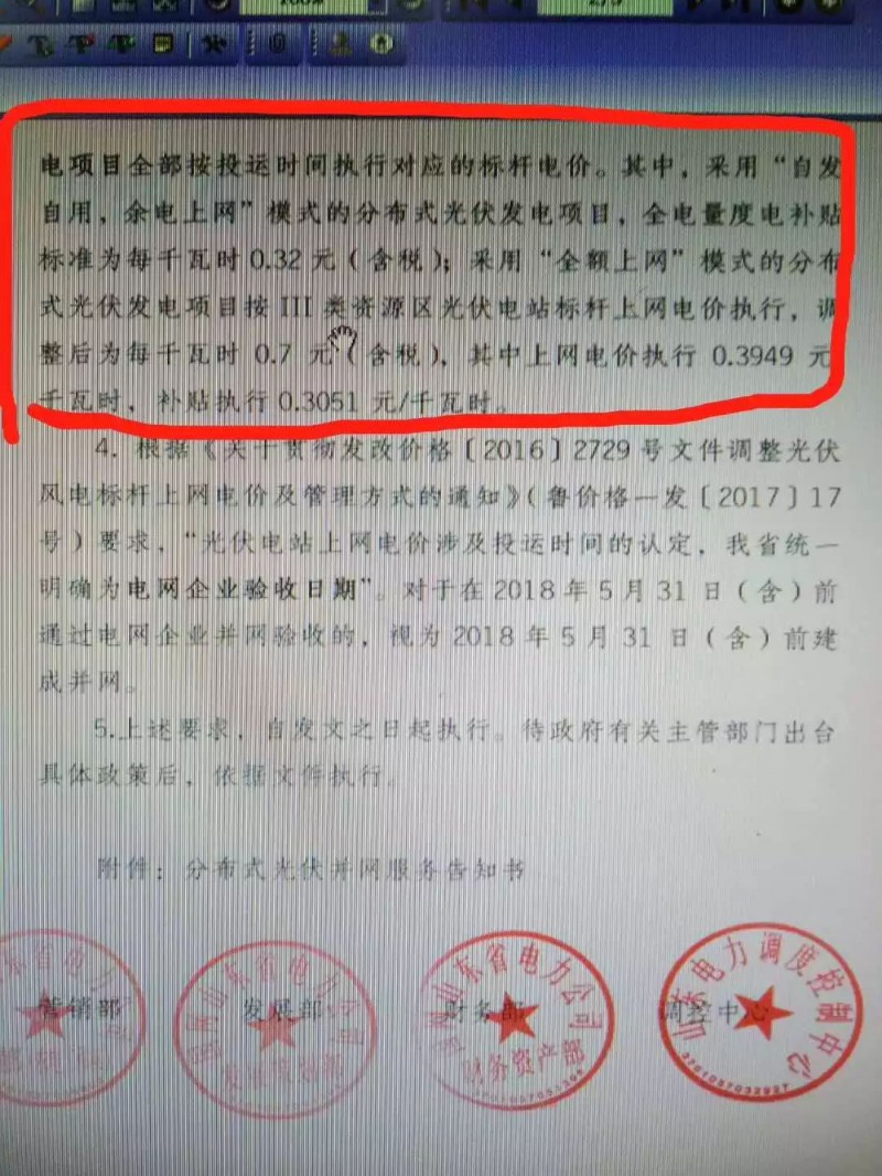 4. 根据《关于贯彻发改价格[2016]2729号文件调整光伏风电标杆上网电价及管理方式的通知》(鲁价格一发[2017]17号)要求,“光伏电站上网电价涉及投运时间的认定,我省统一明确为电网企业验收日期”。对于在2018年5月31日(含)前通过电网企业并网验收的,视为2018年5月31日(含)前建成并网。