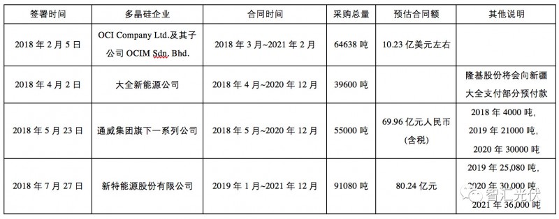 2018年7月27日,隆基股份公告,为了更好地满足高效单晶产品未来的市场需求,隆基股份子公司银川隆基、宁夏隆基、保山隆基、丽江隆基与新特能源、新特晶体硅签订了长单多晶硅料采购合同。合同采购量合计91080吨,预估合同总金额约80.24亿元。根据协议:2019年1月至2021年12月合计采购数量91,080吨,其中2019年合计采购数量25,080吨,2020年合计采购数量30,000吨,2021年合计采购数量36,000吨。