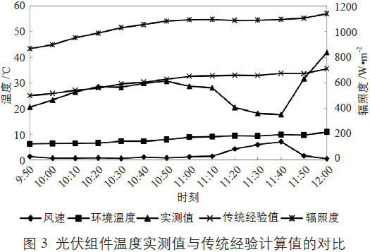 图3 是传统经验估算值与实测值的对比分析。从图中可看出,经验计算值与实测值误差较大,尤其是风速增大时,光伏组件的温度显著下降,而传统经验公式计算的光伏组件温度却仍然是随着太阳辐照度的增加而增加,显然未考虑风速对光伏组件温度的影响。在实际工作环境中,风速是个变量,尤其是在太阳能资源良好的内蒙古地区。因此,在估算光伏组件工作温度时,风速的影响不容忽视。