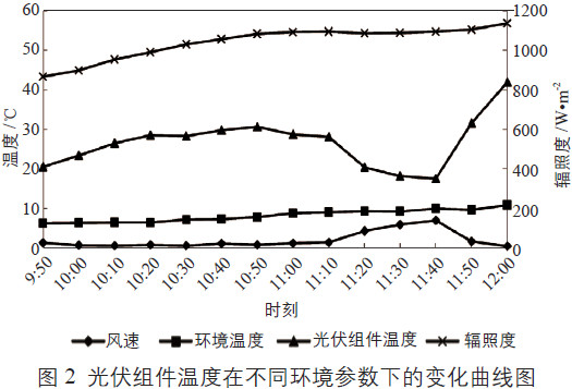 随着太阳辐照度的不断增加,光伏组件温度、环境温度与风速的关系如图2 所示。在无风风力极小的状态下,光伏组件的温度随太阳辐照度的增加而增加;但随着风速的逐渐加大,光伏组件表面对流换热效率提升,光伏组件温度急剧下降,在30 min 内,风速从1 m/s 升高到8 m/s,光伏组件温度从31 ℃降低到16 ℃,温差达到15 ℃。此时,环境温度波动很小,一直保持在9 ℃左右。但即使在风速达到8 m/s、光伏组件温度降低到16 ℃时,光伏组件温度仍然高于环境温度。