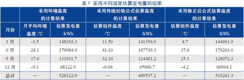 通过以上的计算和分析可知,对于工程实际当中的光伏发电量计算有必要通过一种有效的温度估算方式来确定光伏组件的温度,提高工程计算精度,从而更好地实现工程利用的价值。
