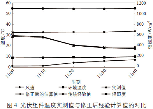 利用修正后的经验公式估算的光伏组件温度数据与实测数据进行对比,如图4 所示。结果显示,误差很小,基本吻合。由此说明,在工程实践中,可以利用式(16) 估算光伏组件温度,以此相对精确计算光伏组件发电量。
