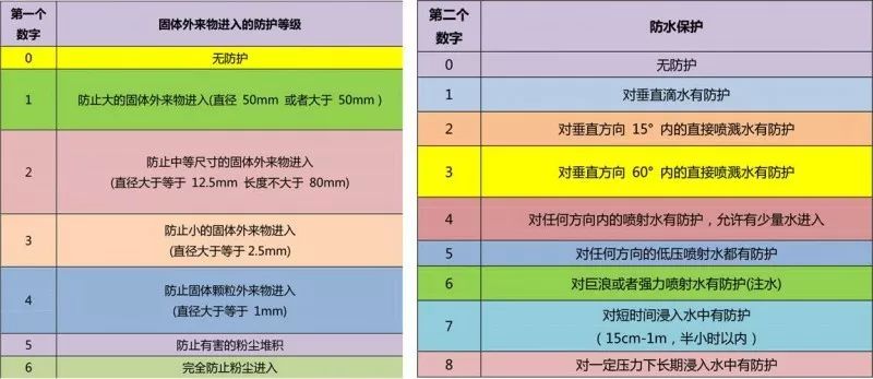 IP是国际用来认定防护等级的代号 IP(Ingress Protection)等级由两个数字所组成,第一个数字表示防尘;第二个数字表示防水,数字越大表示其防护等级越佳。