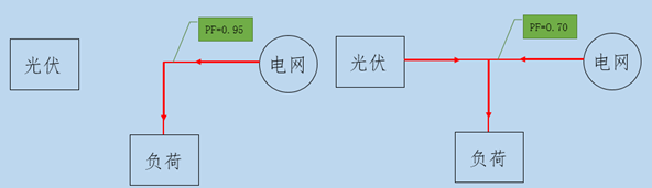 夏季是负荷用电高峰期, 对于工业用户和装有带负荷调整电压装置的电力用户来讲,当光伏没有接入,功率因数在0.9以上,不会产生力率电费(罚款)。当光伏接入时候,由于负荷较大,假设光伏发的电全部被负荷消纳,电网只补充了小部分的有功和全部的无功,导致电网侧功率因素偏低,如下图所示。