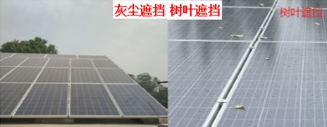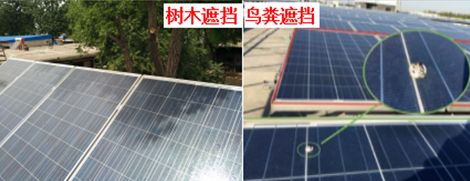 组件的遮挡,哪怕是一丁点遮挡都会导致整个组串的发电量下降;夏季飞扬的尘土、飞来飞去的鸟、茂密的树木都会在组件上留下阴影遮挡导致发电量不理想。