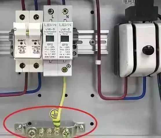 防雷接地:交流侧防雷保护一般由熔断器或断路器和防雷浪涌保护器构成,主要对感应雷电或直接雷或其他瞬时过压的电涌进行保护,SPD的下端接到配电箱的接地排上,如下图所示。