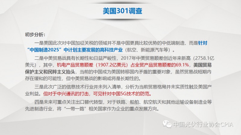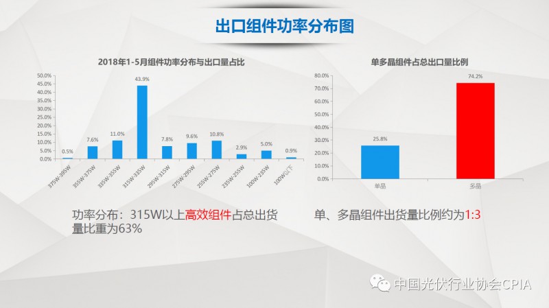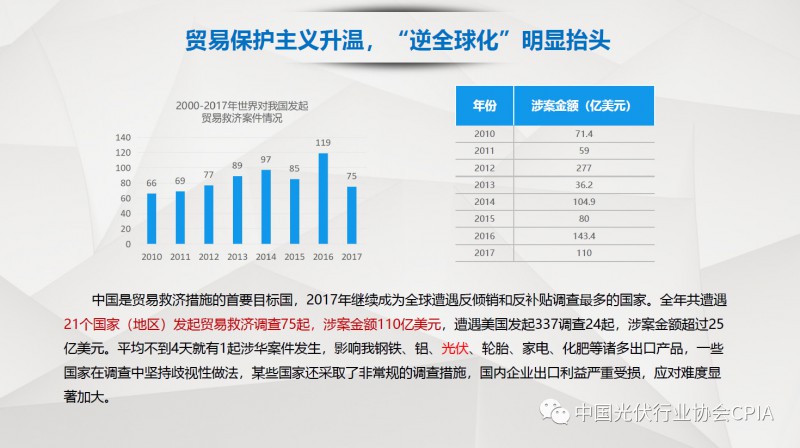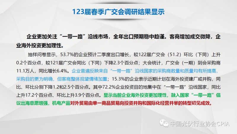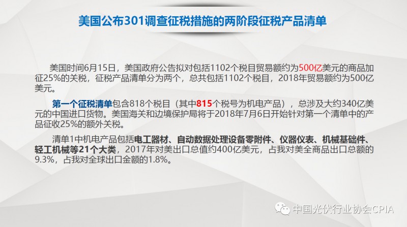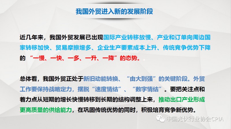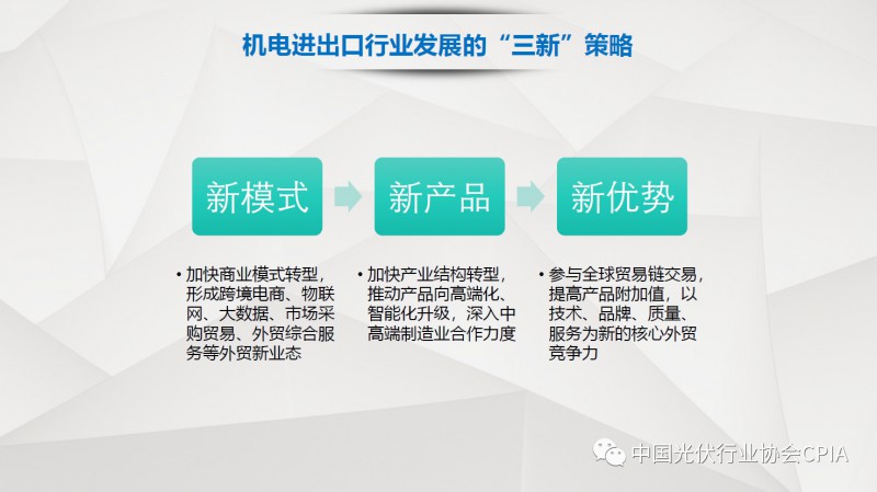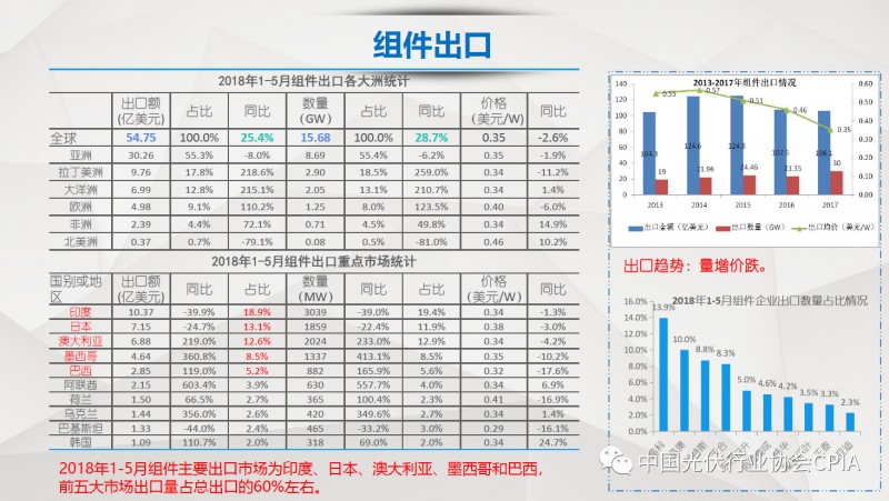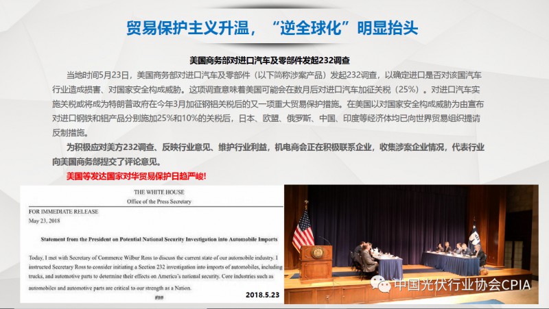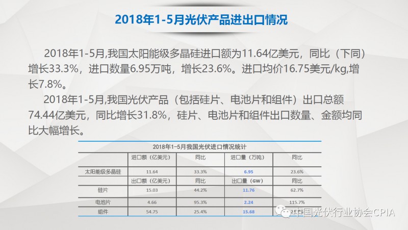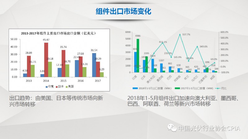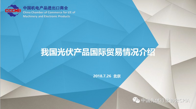 7月26日召开的光伏行业2018年上半年发展回顾与下半年形势展望研讨会上,中国机电产品进出口商会光伏专委会张森秘书长详细分享了整个产业链环节和组件的数据,同时也对国际贸易的形势、走势以及影响做了全面系统的梳理。建议大力发展高质量、高档次、高附加值的出口产品。根据国家产业政策进行产品结构调整,提高产品技术含量,同时扩大出口渠道,开拓新的出口市场。