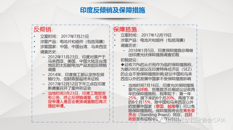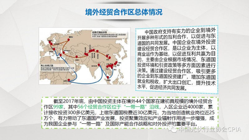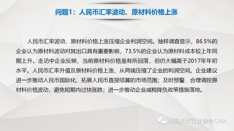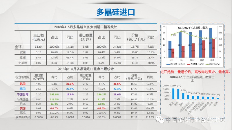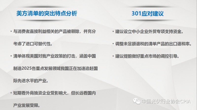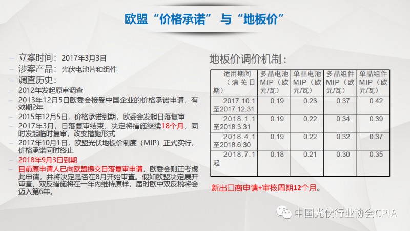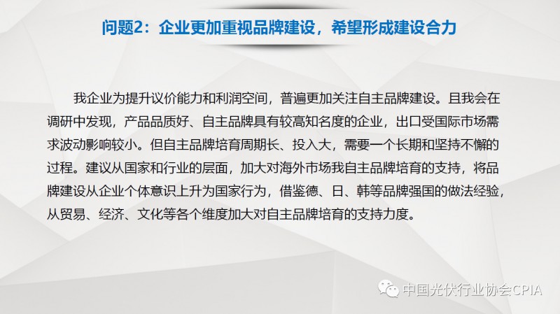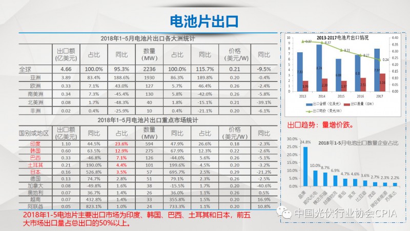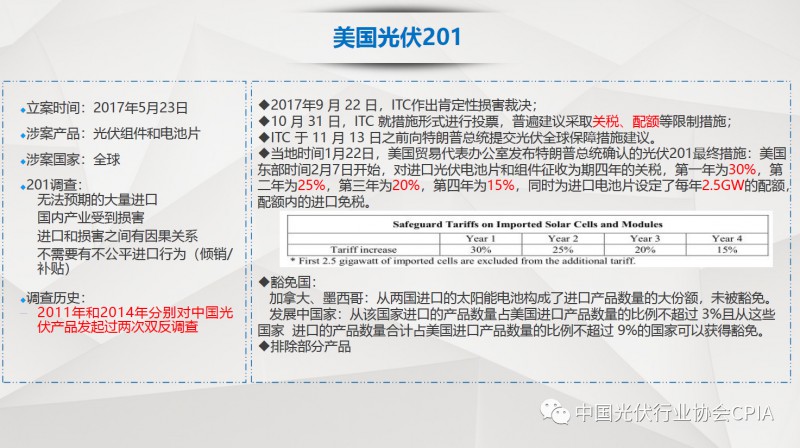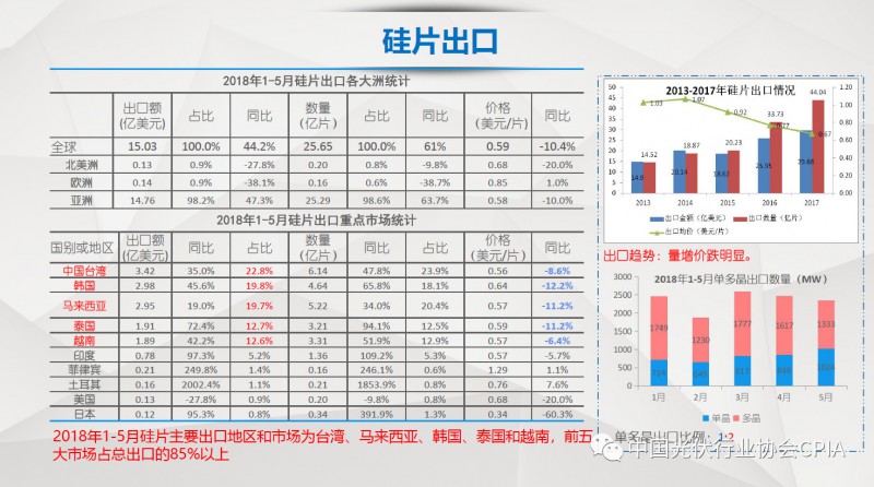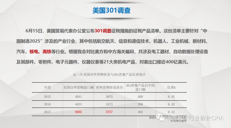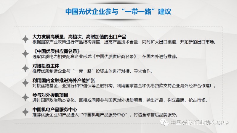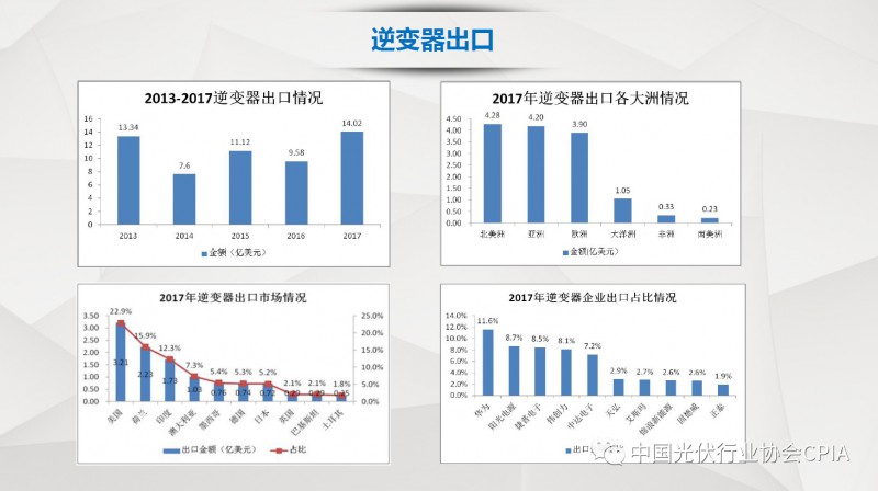 7月26日召开的光伏行业2018年上半年发展回顾与下半年形势展望研讨会上,中国机电产品进出口商会光伏专委会张森秘书长详细分享了整个产业链环节和组件的数据,同时也对国际贸易的形势、走势以及影响做了全面系统的梳理。建议大力发展高质量、高档次、高附加值的出口产品。根据国家产业政策进行产品结构调整,提高产品技术含量,同时扩大出口渠道,开拓新的出口市场。