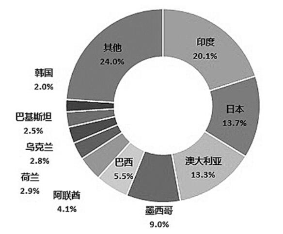 2018年上半年,我国多晶硅进口量约为6.7万吨,同比下滑4.3%。2018年1—5月电池片和组件出口总额55.13亿美元,同比增加21.2%。其中电池片出口额3.53亿美元,组件出口额51.6亿美元,组件出口量约16GW。我国2012—2016年出口额一直处于下滑态势,2017年再次实现增长,2018年1—5月继续保持增长态势,而且是在产品价格持续下滑的态势下取得的。这主要是由于中国海外的电池片、组件产能开始释放,这两个环节各有8GW的海外产能,拉动了硅片和电池片的出口,同时我国光伏企业开拓国际市场的步伐也在进一步深化。从出口区域结构来看,集中度继续降低,对出口前10名国家的出口金额占比为76%,同比下滑7.6个百分点,对澳大利亚、墨西哥、巴西、阿联酋等新兴市场出口快速增长。
