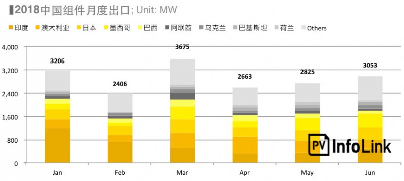 根据PV Infolink 海关出口报告显示,2018上半年中国组件累计出口近18GW,整体海外市场需求十分不错,撇除受到贸易壁垒影响的印度及美国,2018上半年整体海外市场需求十分稳定,中国组件出口至澳大利亚及日本的总量分别超过2GW,出口墨西哥组件总量亦达1.8GW,其余对巴西、阿联酋、乌克兰、巴基斯坦等市场的出口亦累计超过500MW以上。