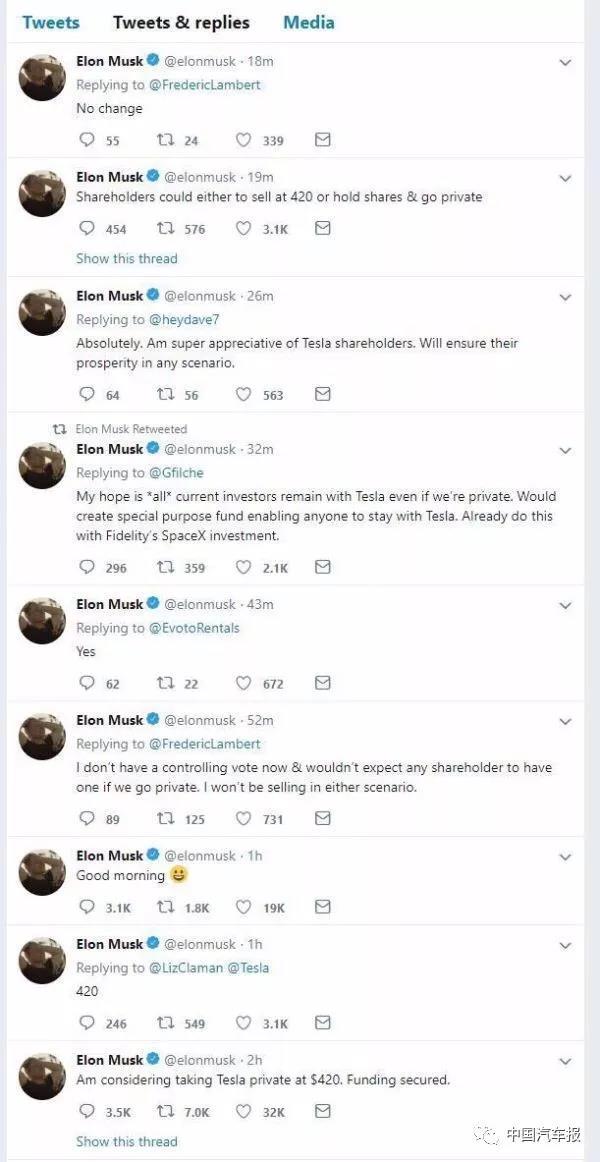 美国当地时间7日上午,特斯拉CEO埃隆•马斯克在社交平台Twitter上发布公开信,称其打算以每股420美元的价格从公开市场回购特斯拉股权,将公司私有化,但最终能否实现还需股东投票决定。