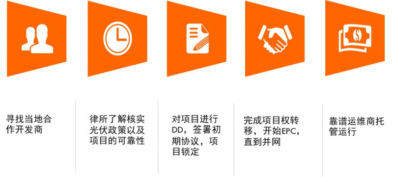 为了避免海外项目的风险,需要注重开发流程的每一步,在每一步都做好调研和核实:第一步,寻找当地的开发合作商,这是最难的一步,开发商的能力影响着整个项目,自行开发项目耗时又比较长,所以在开发合作商需要着重考虑。第二步;通过律所了解当地光伏政策,并核实项目可靠性;第三步,对项目进行DD(due diligence,尽职调查)、签署初期协议,项目锁定;第四步,完成项目权转移,开始EPC,直到并网;第五步,托付优质的运维商进行运行维护。