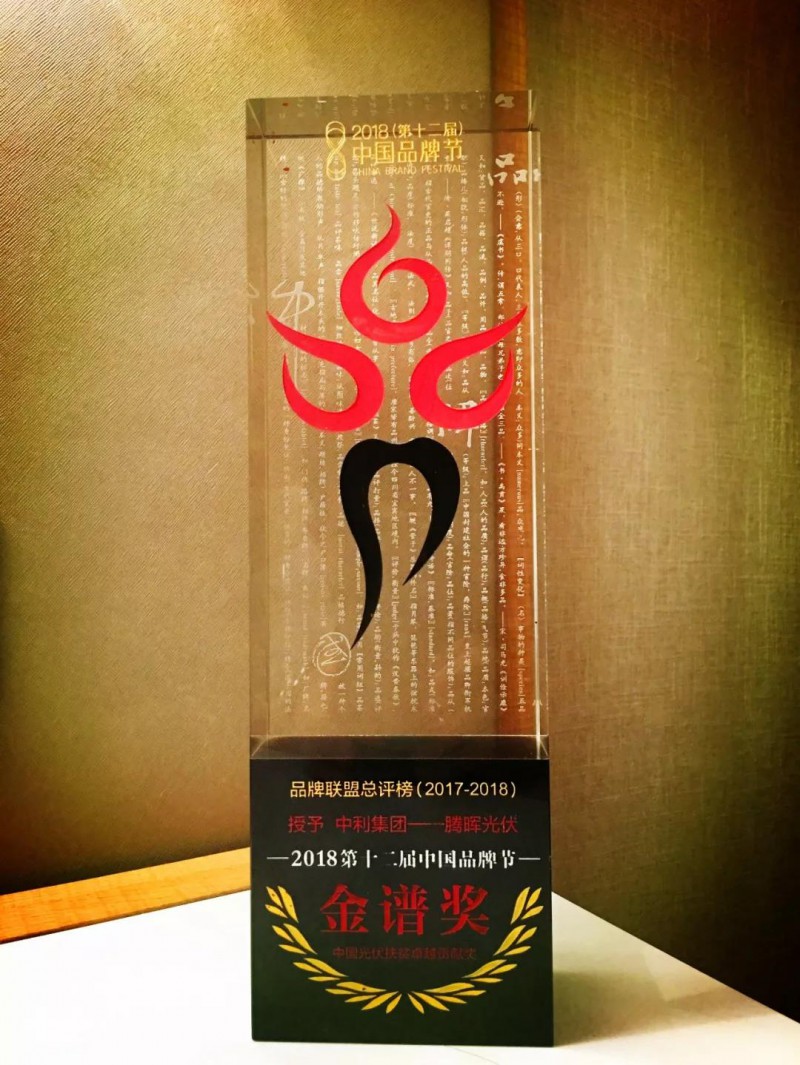 8月8日,由品牌联盟主办,以“定力与奋进”为主题的2018(第十二届)中国品牌节在成都中国西部国际博览城隆重开幕。中利集团——腾晖光伏荣获“中国光伏扶贫卓越贡献奖”和“光伏产业领军品牌”两项品牌大奖。