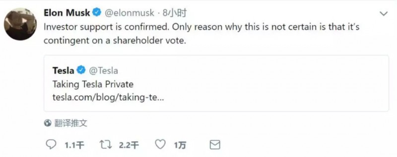 如之前所提到的,我上周二宣布这一消息,是因为我认为这样做是正确的、公平的,所有的投资者都应同时享有相同的信息。我将继续与投资者对话,并且我也聘请顾问调查一系列可能的架构和选择。除此之外,这也会让我更准确的了解到,如果特斯拉私有化,特斯拉现有的公众股东中有多少会继续是股东。