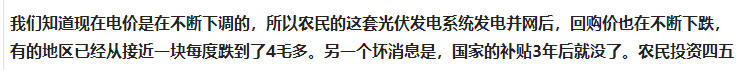 文中“国家补贴3年就没有了”,则是理解上的问题和概念的混淆。行业分析预测,2-3年左右,随着光伏电站光伏成本不断下降,光伏行业也将不会有国家补贴(光伏平价上网),靠卖电的收入就有很好的收益了。之前安装的光伏电站,还是按照电站并网时的补贴电价补贴20年,完全不用担心的。这些也都是有国务院和发改委相关政策文件的。