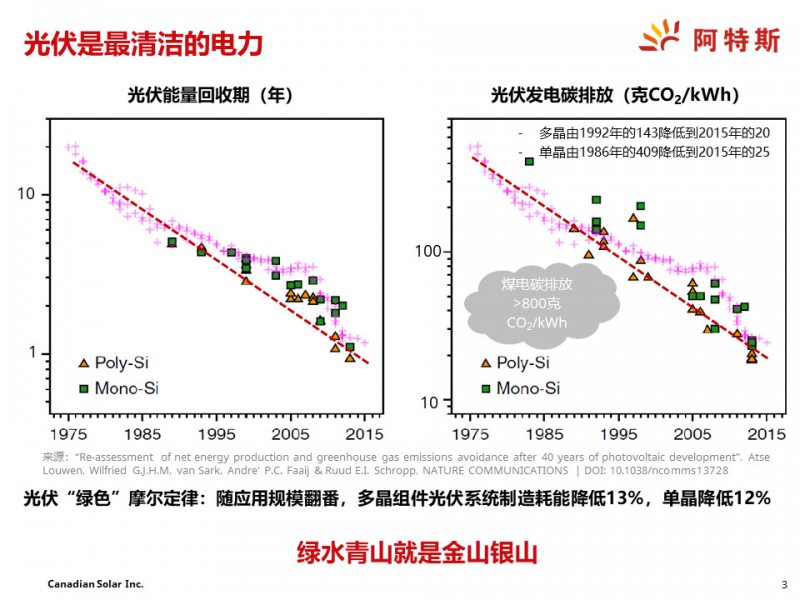 为什么我们要做光伏?因为光伏真的是绿水青山,今天早上的一个主题演讲上特别讲到绿水青山,还播放了我们习主席关于绿水青山的那段讲话录音。你看光伏系统制造过程中的耗能大约一年就可以收回来,光伏系统可以用20年、30年,所以这个能量回收比是非常高的。光伏发电的碳排放已经达到20左右,所以说新能源真的带来了绿水青山。