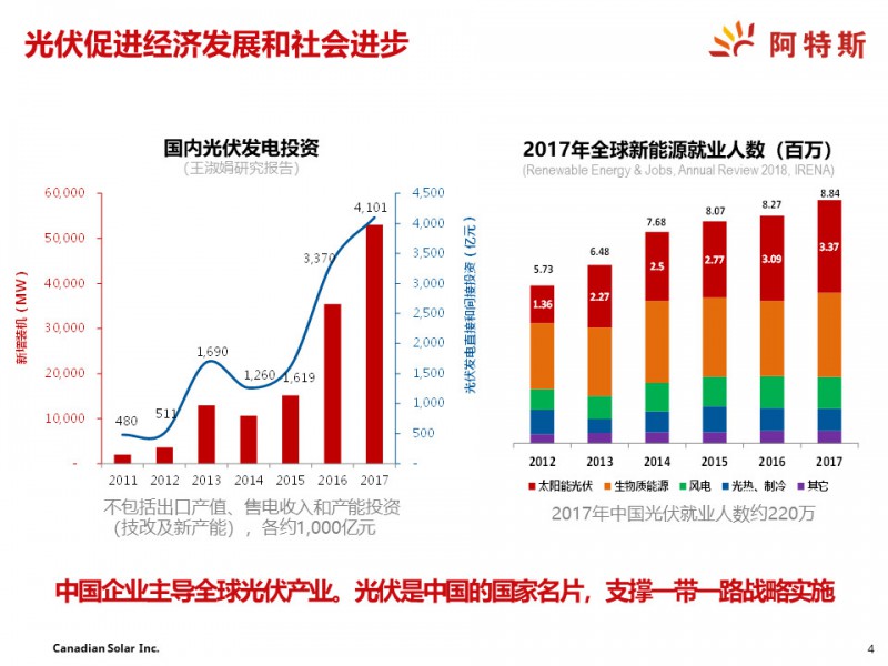 为什么说绿水青山就是金山银山?这里有几组数据,去年光伏的太阳能电站的投资以及中国光伏产品的出口产值、售电产值以及制造业方面的产能投资,我们阿特斯做了一个统计,大约要达到8000亿,这个对于中国的经济是多大一个带动?这就是金山银山。