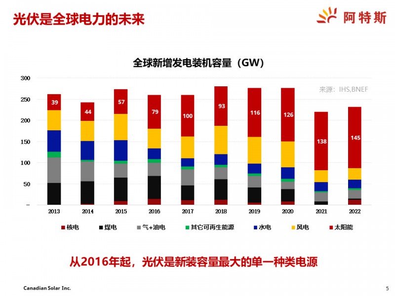 往下走会怎么样?这张图展示了前5年和后5年全球每年新增发电装机容量,看看是用什么样的发电技术带来的。这个信息,我们李俊峰老师会比我更熟悉,我记得2015年的时候在北京的一个会上我就跟李老师谈过,在2015年我们说2014年是一个天翻地覆的年度,因为在2014年历史上第一次新能源的投资超过了传统能源的投资,不知不觉之间新能源成了带头大哥。再往后推两年,2016年,又出现了天翻地覆的变化,在这一年中不知不觉光伏成了带头大哥。再往后会怎么样?如果时间推到2021年,到那个时候光伏的年度新增容量会超过各种发电新增容量的总和,到那个时候每年新增容量的一半以上可能就是光伏了。达到这一点以后,我想它往下会一直延续走下去。说明什么?说明我们正在经历一场全球能源结构的变革,巨大的变革,巨大的解构。变革的过程中会出现很多机会,这个机会就是中国的新能源企业,当然也是世界的新能源企业,同时中国的光伏企业,迎来的海阔凭鱼跃,天高任鸟飞的机会。