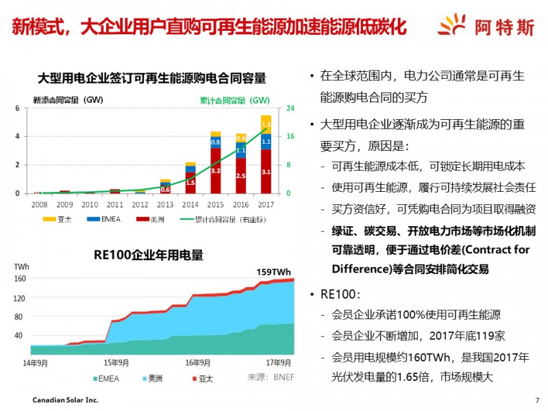 在新的商务模式,在新能源发展的很多新的一些商务模式上,中国并不领先。比如说阿特斯在海外,在美国开发了很多光伏电站,我们是2009年从加拿大开始开发光伏电站,然后在美国开发电站。我们开发电站,说起来在北美,已经10年时间了,早期的时候所有的购电合同,长期售购电合同都是跟电网企业签的,再早点儿还一定是和国家背书的电网企业签的。最近两年不是这么回事了,最近两年如果你是真正懂美国市场,在美国光伏电站的这些开发建设市场,真正在那儿打拼的话,你会发现不是这么回事了,很多都是跟私营企业签的,这些私营企业最多的是新经济企业、数据化企业、互联网企业。美国有一个新的联盟,RE100,就是自愿参加,承诺100%使用清洁能源。参加的企业都会先亮出账单来,我买的电大概有多少是清洁电,多少电是传统能源不清洁电,提一个时间表,10年也行,20年也行,反正到某一个点做到我用的电能够是100%清洁能源。美国所有新经济的公司几乎全是这个里面的成员,但是中国企业的数量几乎是零。