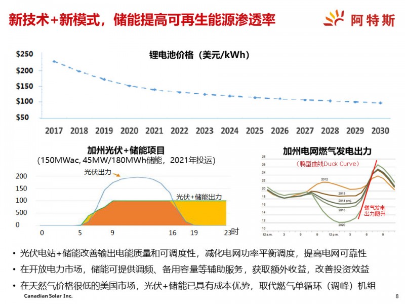 再往前走,我们还会看到什么障碍?障碍就会带来机会,我们还会看到什么机会?这张图今天上午几位演讲者已经讲到,这就是光伏和储能的结合,我就不多讲了。但是你看左边这张图显示,比如说在加州光伏发电本身是一个大圆包,从早晨9点钟到下午4点钟那是最多的,但是如果你加上储能,我就可以移过去,使得平缓发电时间可以延续到23点钟。如果不这么做会出现什么情况?会出现下一张图,这个在加州叫鸭形曲线,因为你看光伏之外的那些电网的处理,到中午的时候越来越,就像鸭背一样,到下午和晚上出力的爬升非常陡峭,这个陡峭就是成本。但是有问题就会有挑战,这个挑战会带来新技术+新模式,带来储能跟光伏的结合。