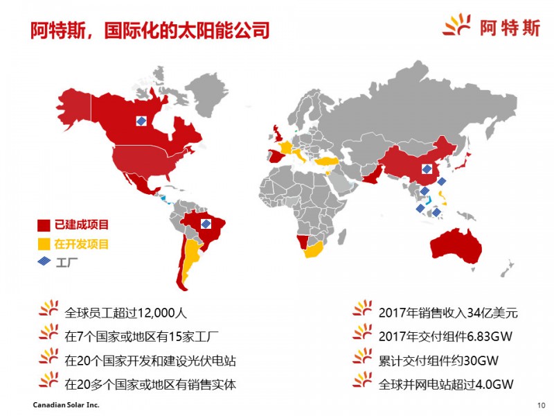 阿特斯是2001年创建的,到现在已经马上要走到第17个年头了。我们业务踏遍世界六大洲,好像除了南极洲以外,其他的地方应该都有涉足了。