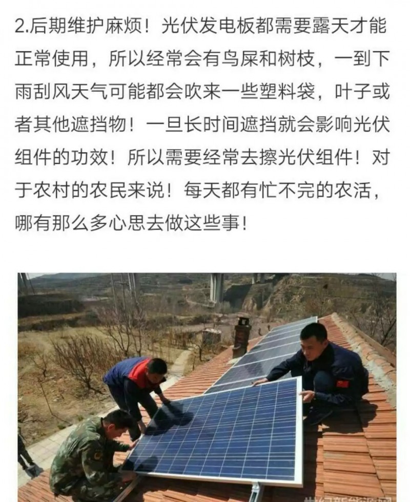 首先,虽然扶贫电站大多数是建在接近大自然的农村,但是农村也没这边多的小鸟和漫天飞舞的塑料带吧!对此,小盒子表示写这篇文章的小编肯定住在高楼林立的城市,不然也不会对农村的环境又这么大的误解。其次,光伏板在施工时已经设置了倾斜角度,遇到下雨天气,雨水会顺着倾斜角度洗刷灰尘,这样也减少了运维成本。最后,扶贫电站的后期维护根本不用农民操心,会有专业的运维人员对电站进行定期维护,而且费用是由安装商支付。这位小编怕是不懂什么是运维吧!