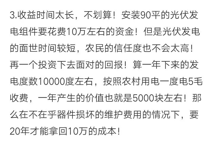 对于上图中提到的“巨大投资”小盒子表示很可笑。这根本就是在偷换概念。家庭光伏电站和扶贫电站根本是两个概念。家庭光伏电站是需要自己投资成本建成的,而扶贫电站的成本由国家和当地政府资助以及企业建成的所以“巨大投资”的问题根本不存在。