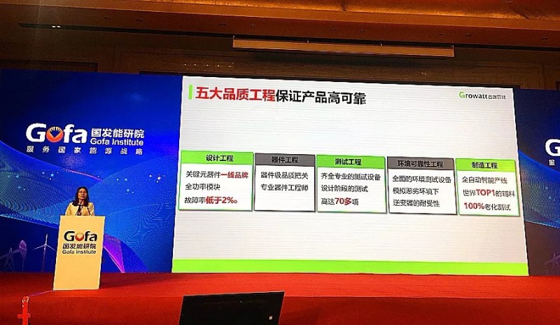 据国家统计局数据显示,2017年末,全国农村贫困人口约有3046万人。光伏扶贫也已经成为农村发展的新希望,农户在屋顶、荒坡上安装光伏电站之后,不仅可以解决自己家的生产、生活用电,多余的电力还可以并网销售,获得收入,也已成为国家攻坚脱贫的重点战略。古瑞瓦特积极响应国家政策和市场需求,通过“高收益、高可靠、高安全、易维护”4大优势,不断助力客户降本增效,助力光伏扶贫快速发展。古瑞瓦特市场总监张利霞以《逆变器核心科技助力光伏扶贫安心工程》为演讲主题,向与会嘉宾分享了古瑞瓦特的核心科技。用“三高一易”为现场的嘉宾打了一针“催燃剂”:
