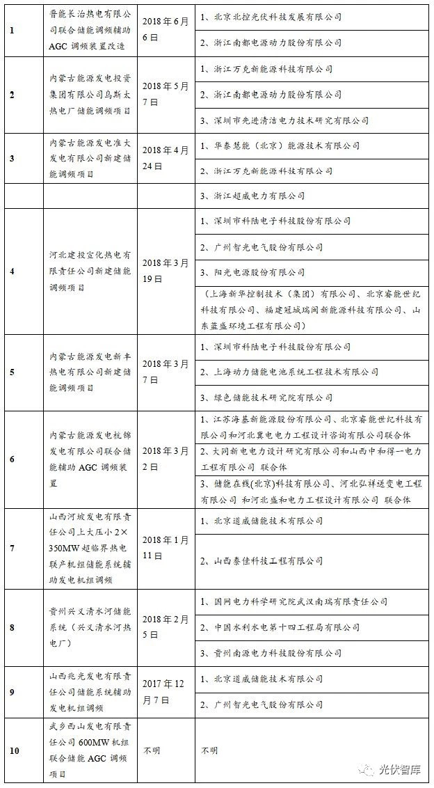 2017年,“火电+储能”调频项目屈指可数,而今年全国项目数量已经增加至30个,并且下半年将会密集开工一批项目。以山西为例,2017年项目数量仅为3个,今年已有12个。从区域范围来看,已规划出台调频辅助服务市场包括有华北区域(山西、京津唐)、广东,两个主要区域,此外华东区域也大概率在下半年推出市场化。目前,山西、内蒙(华北电网区域部分)、广东等省份的“火电+储能”调频项目陆续落地,市场望继续爆发。下表为2018年上半年公开招标的储能AGC调频项目汇总: