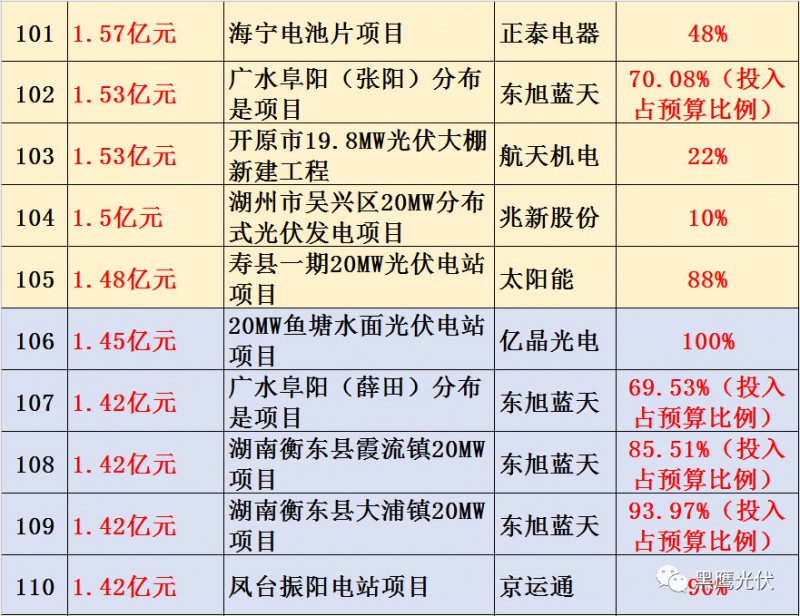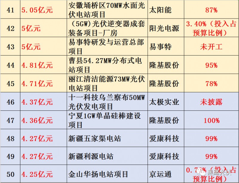 而为了读者对合作伙伴、或竞争对手的投资布局有一个更为直观细致的了解,黑鹰光伏团队还查阅了这一百多家企业的“在建工程”情况,据黑鹰光伏统计,“在建工程”预计投资额在亿元级以上的光伏项目多达118个,隶属于36家光伏上市公司;这118个在建项目总投资预算规模达1031亿元,其中单个投资项目在十亿元以上的共有26个,前三名分别为特变电工、中环股份和保利协鑫。