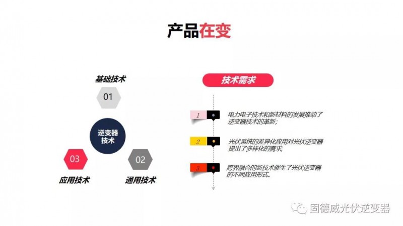 近几年随着电力电子技术发展,包括光伏系统差异化应用,跨界融合新技术,催生了很多应用形式。固德威紧跟技术趋势,持续加大研发力度,通过基础技术、通用技术和应用技术的相互组合,不断使公司产品迭代升级,促成“产品之变”。