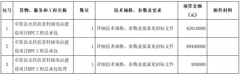 内蒙古招标有限责任公司受内蒙古卓资县卓源扶贫光伏投资有限公司委托,采用公开招标,采购卓资县光伏扶贫村级电站建设项目EPC工程总承包及工程监理。欢迎符合资格条件的供应商前来报名参加。