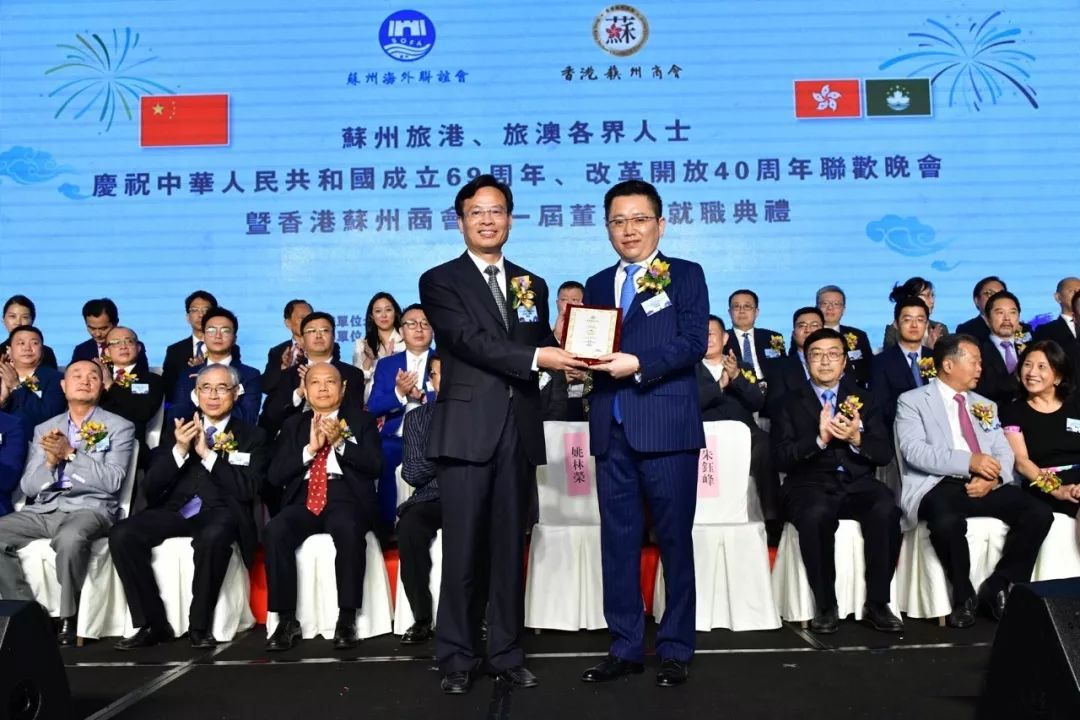(就职典礼上,苏州市委常委、统战部部长姚林荣为香港苏州商会首任会长朱钰峰颁发了委任书。)