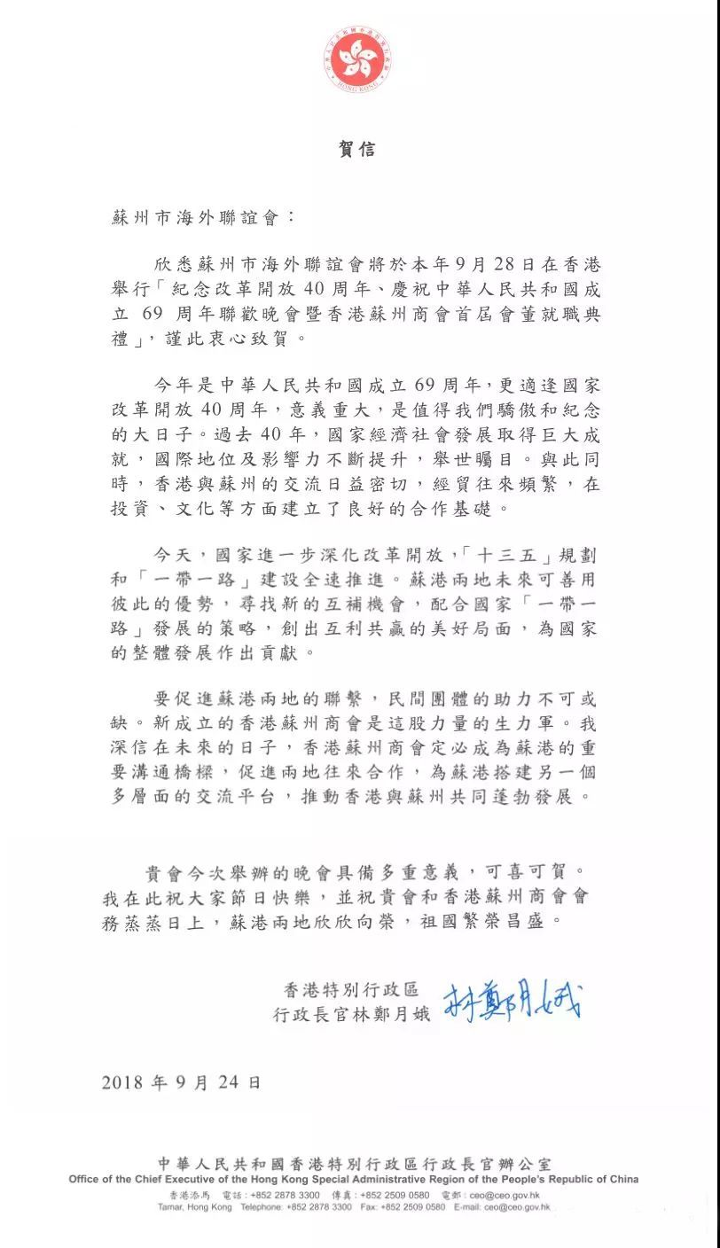 (香港特别行政区行政长官林郑月娥发来了贺信)