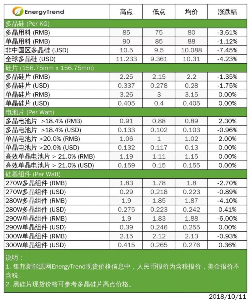 目前大陆国内一般单晶价格在1.00~1.06RMB/W,均价微升至1.02RMB/W。高效单晶则是在1.11~1.19RMB/W,均价维持在1.15RMB/W。310W用的特高效单晶电池片(>21.5%)来到1.20RMB/W的价位,一般多晶电池因市场仍有需求出现,价格则小幅微升至0.88~0.91RMB/W,均价微升至0.89RMB/W。