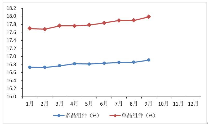 图 15 2018年1-9月单晶、多晶组件转换效率(单位:%)