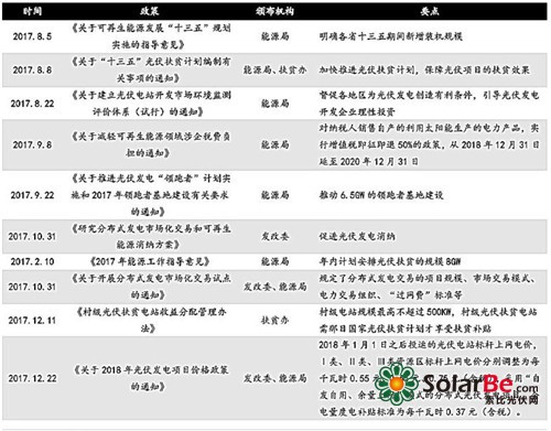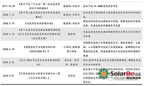 配额制即将落地,或将助力平价上网加速。2018年9月,发改委下发《可再生能源电力配额及考核办法(第二次征求意见稿)》,提出建立可再生能源约束性消纳机制,规划各省级行政区2018、2020年可再生能源电力消费比例,对保障小时数以内的集中式风电、光伏电量以及其他非水可再生能源发电量施行全额保障性收购(考虑技术等限制因素最多限电5%)。配额制若能落地,必将提高光伏电站年利用小时数,进一步降低度电成本,助力平价上网加速。近期光伏政策一览表如下: