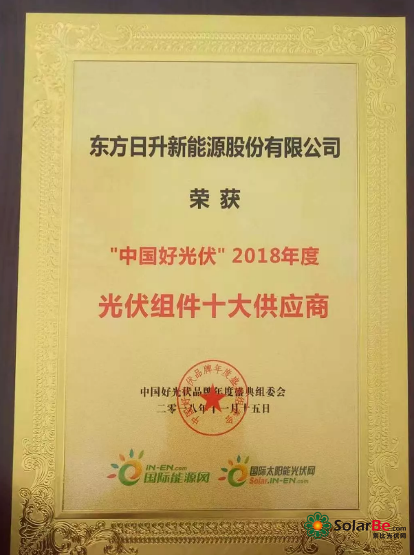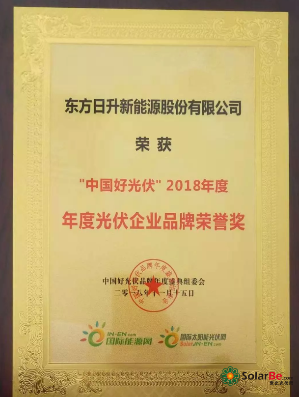 此次东方日升获得的光伏组件十大供应商大奖以及年度光伏企业品牌荣誉,是对东方日升2018年度努力的肯定,也是对东方日升在这一年在产品创新、品牌建设以及服务优先等方面取得的成绩的表彰。东方日升坚信,在全体日升人的合作和行业的支持下,东方日升会不遗余力的为光伏行业的进步贡献自己的力量,与全行业共同进步。