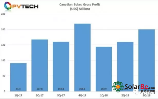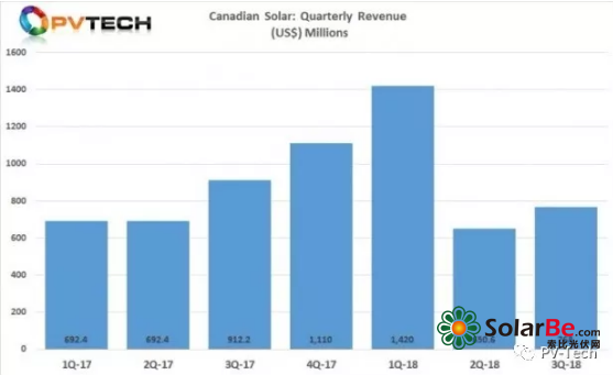 阿特斯公布的2018年三季度收入为7.68亿美元, 较2018年二季度的6.506亿美元增长了18.0%。