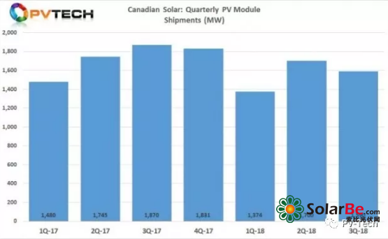 2018年三季度太阳能组件出货总量为1590MW, 2018年二季度为1700MW。