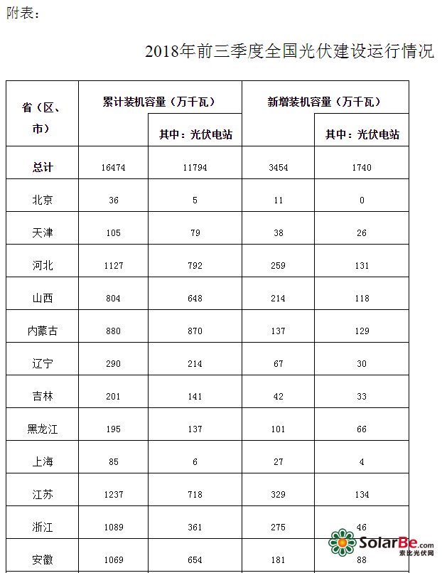 全国各省(区、市)2018年前三季度光伏建设运行情况详见附表。