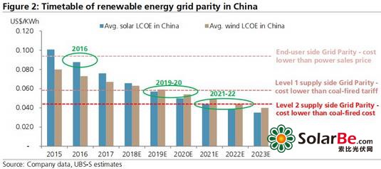 用户侧平价上网在2016年已经可以实现,瑞信认为,第一、二层次的发电侧平价上网预计分别在2019-2020年、2021-2022年实现,比之前预期的快1-2年。