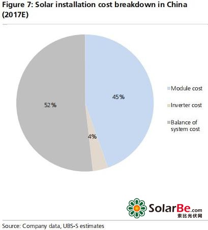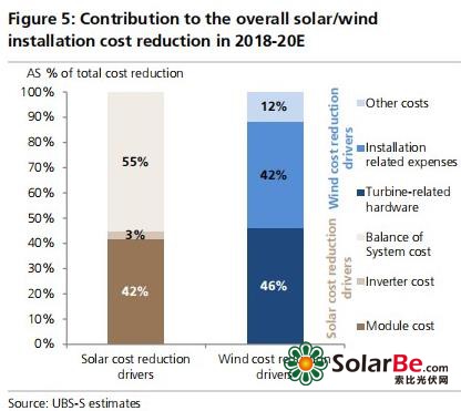 光伏装机成本主要包括光伏模组成本(多晶硅/晶圆/电池/组件成本)、逆变器成本、系统平衡部件(BOS)成本,瑞银预计2018-2020年,这三部分成本分别下降41%、33%、40%。