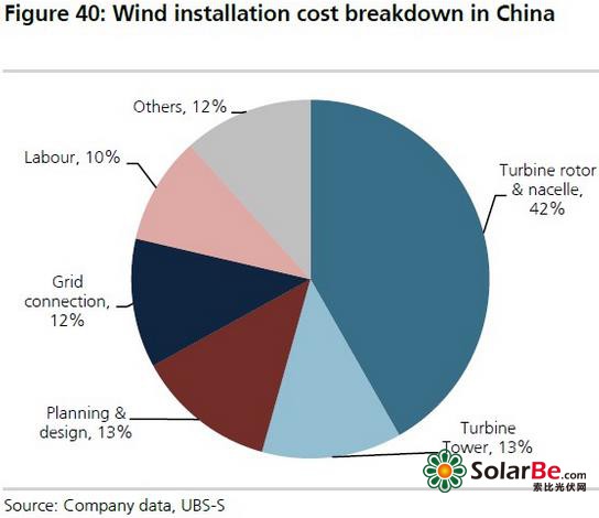 风力发电方面,中国超过98%的已有风电项目是陆上风电项目,瑞银预计未来的增量也以陆上风电为主。陆上风电装机成本主要有两部分构成:与涡轮机相关的硬件成本、安装费用,硬件成本占比60-70%,降低风电的装机成本主要是降低硬件成本。但由于产业链相对短,风电降成本的空间不如光伏。